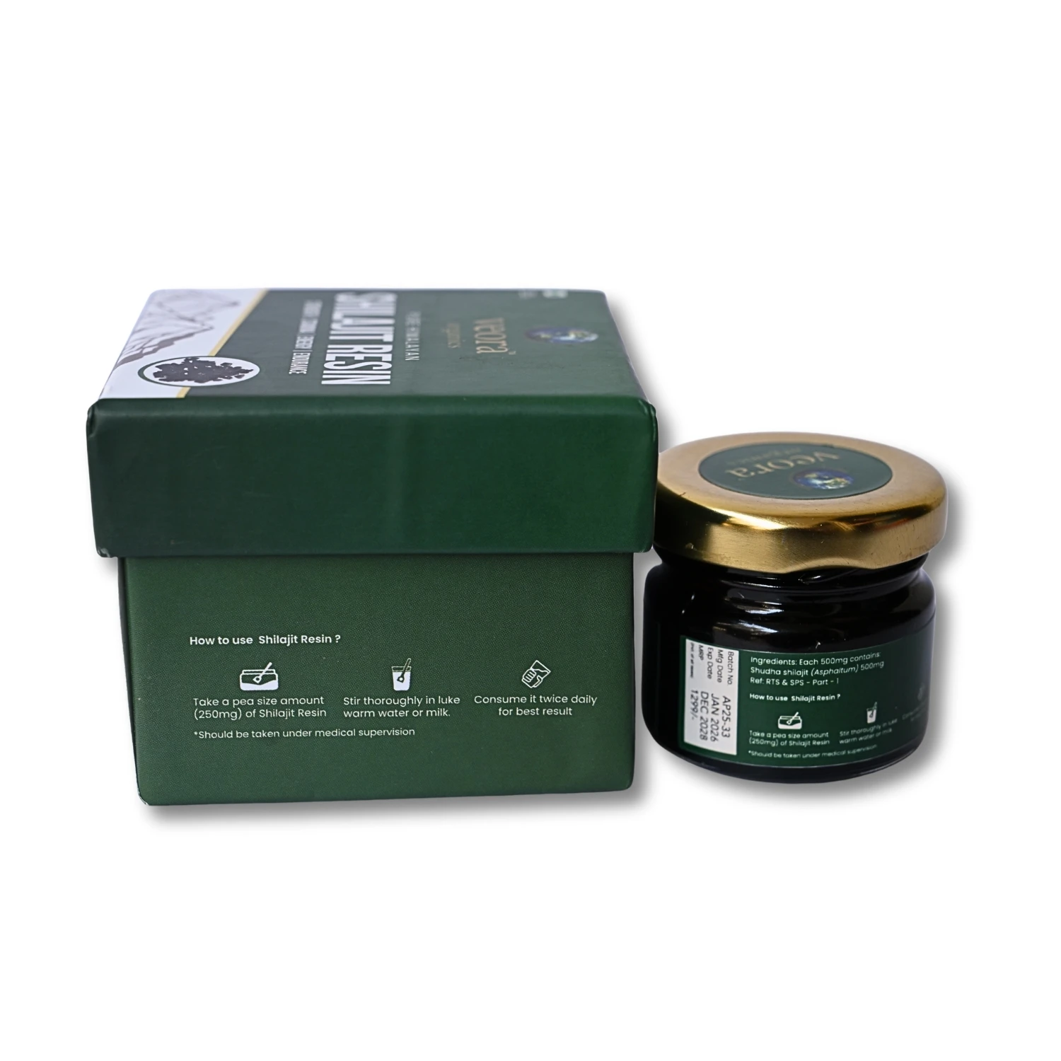 Take a pea-sized amount of Veora Organics Shilajit Resin and stir it into lukewarm water or milk. Consume twice daily for best results.