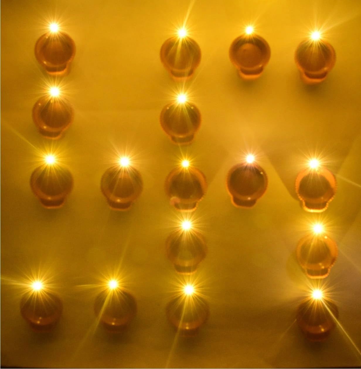 2. FLAMELESS AND SMOKELESS: The Diyas are Lighted from LED and WATER that makes them pollution-free without having to worry about flame, absolutely no fire danger or burning risks, No hot lamp or oil to deal with, Safe for Families with Pets or Young Children simultaneously giving the look and feel of original clay diyas.