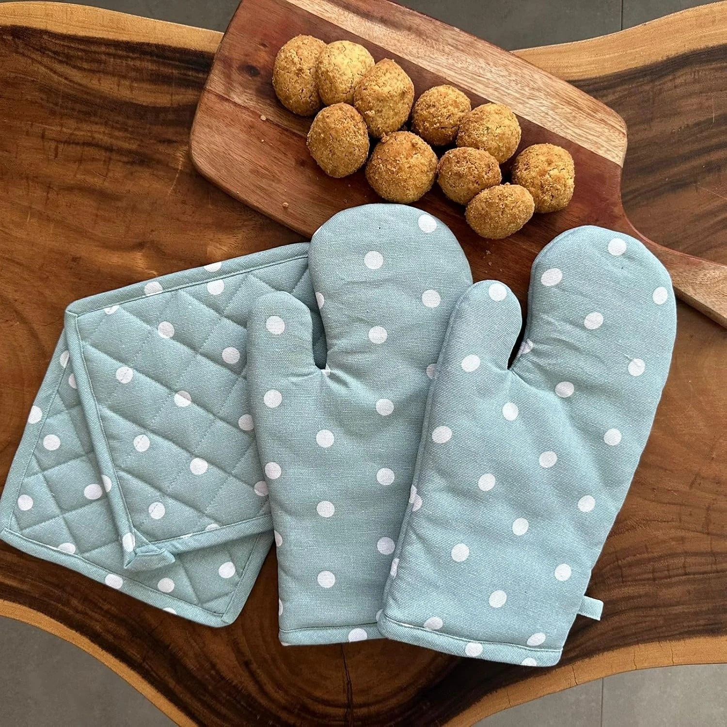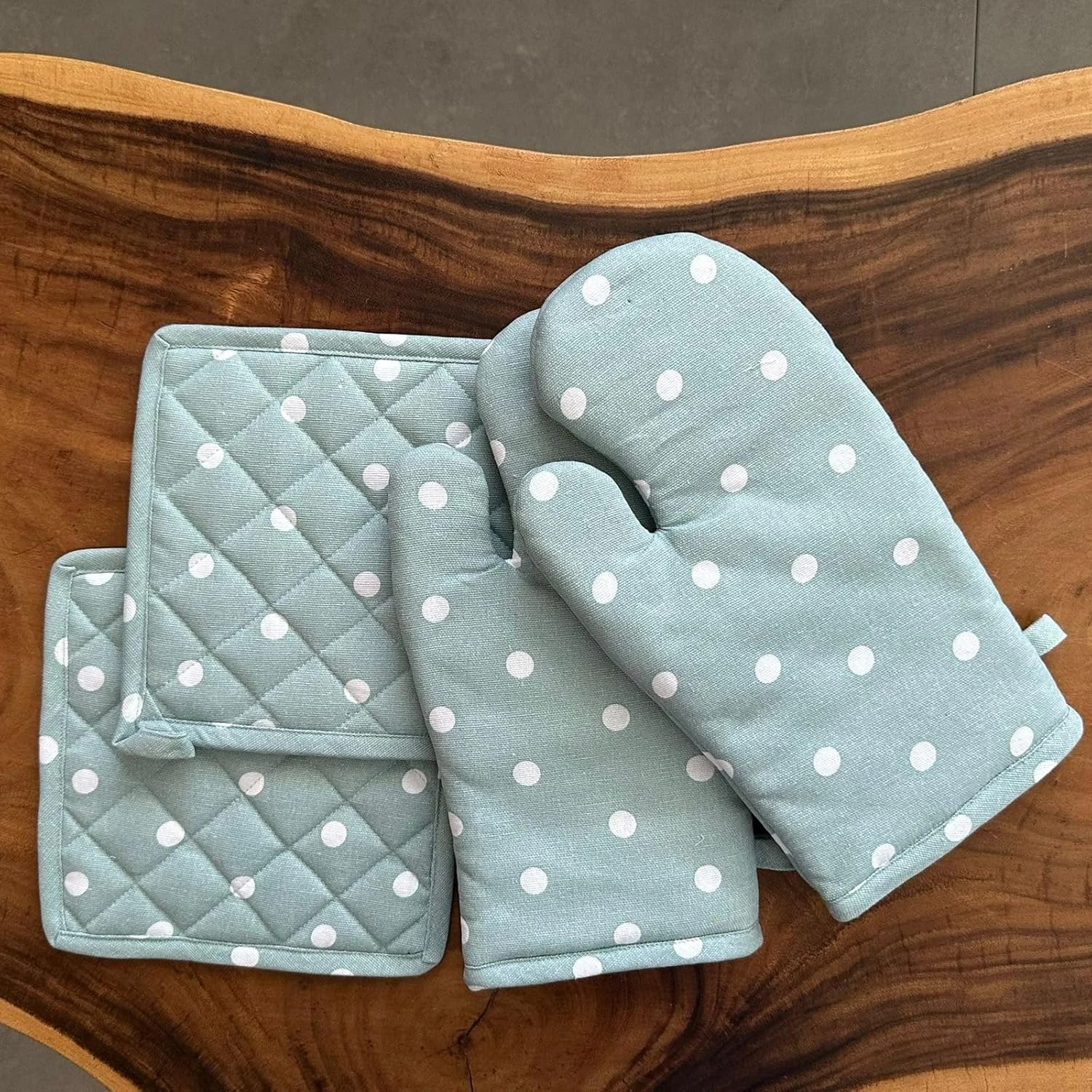 • Crafted from 100% cotton, these oven gloves and pot holders offer exceptional durability and heat resistance. They are designed to withstand the rigors of everyday cooking, providing reliable protection while handling hot pots, pans, and dishes.