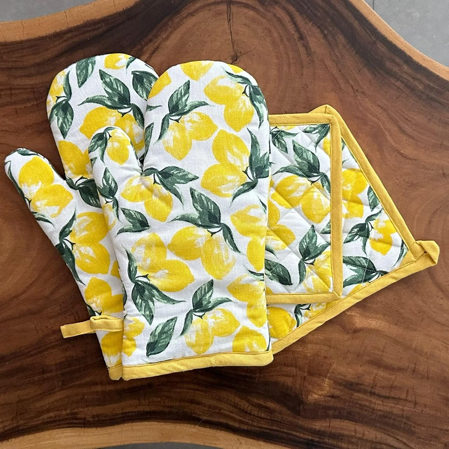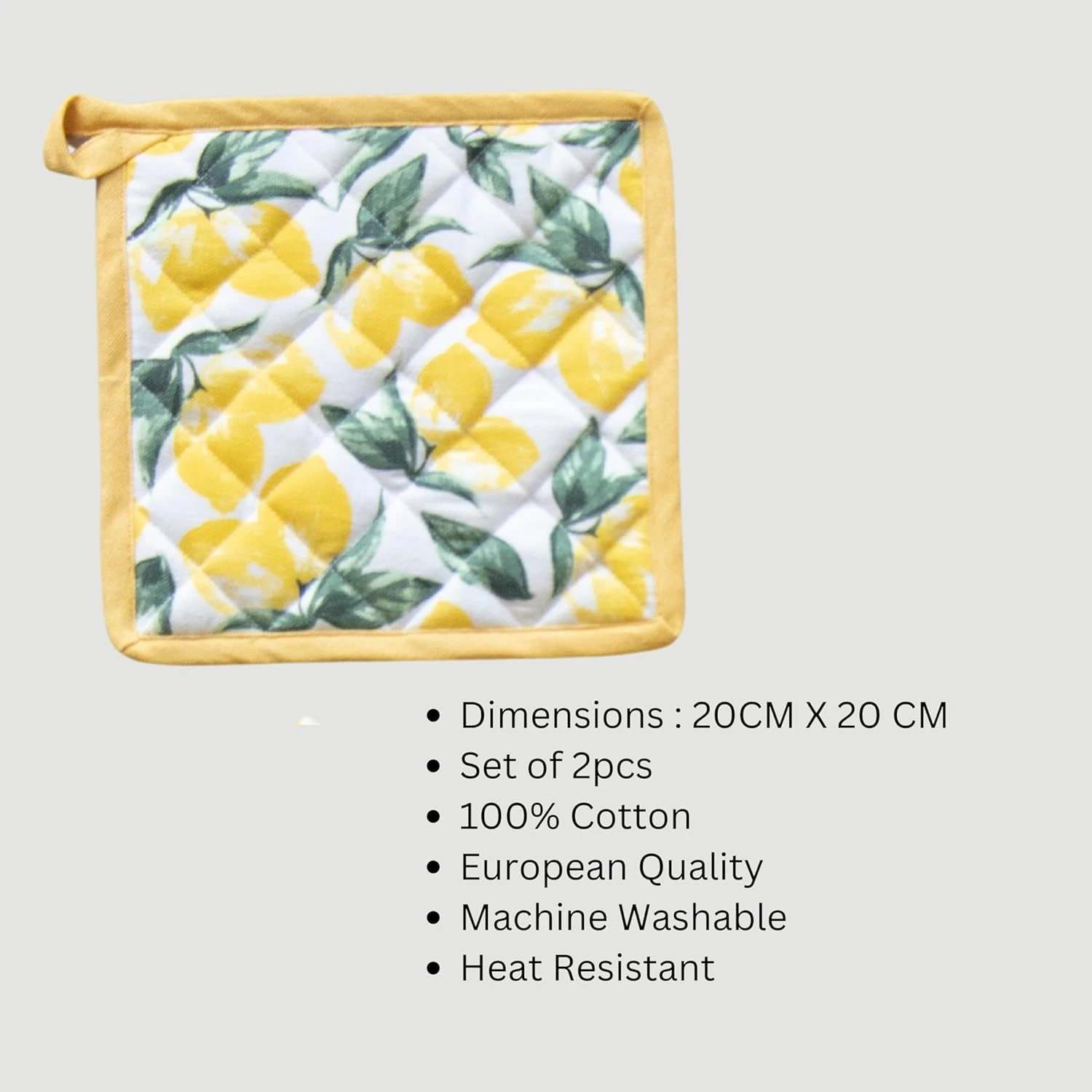 100% Cotton 2 Oven Gloves with 2 Pot Holders- Premium European Quality, Heat Proof, Cushioned & Washable | Oven Mitts for Baking & Grilling (Lemon Yellow)