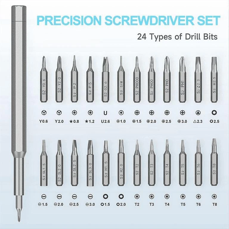 5. True All-Rounder The Precision Screwdriver Set Has 24 Mini Screw Bits, Which The Shape Is Marked Inside The Case, And The Corresponding Model Is Engraved On The Bits. Easy To Find The Tool You Need Quickly. Suit For Tablet, Watch, Camera, Glasses, Computer, Mobile Phone, Laptop, Keyboard, Ps4, Headphone, Drone, Game Console And Other Electronic Repair And Care.