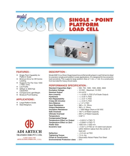 | Description | : | | Model 60810 is a strain gage based low profile bending beam load cell and is ideal for precision large platform scale applications. It is designed for low eccentric sensitivity. Its tool steel construction is very rugged to withstand shock loads. This supports large platform size of 1 X 1 Mtr. It is constructed from tool steel for heavy shock loads. | Features | : | | Single point capability for platform scales. Minimum error for off center loading. Supports the pan size of 1000 X 1000 mm. Low profile. 500Kgf. To 3000Kgf. Capacities offered. Moisture proof sealing. | Electronic Instrumentation / Software | : | | Compatible Instruments with Relay output, 4-20 mA or 0-2 Volt Output Digital Version with RS-485 interface / USB output Blue Tooth Telemetry / Wireless Telemetry Software for Graphic, Tabulation, Reporting and Analysis |