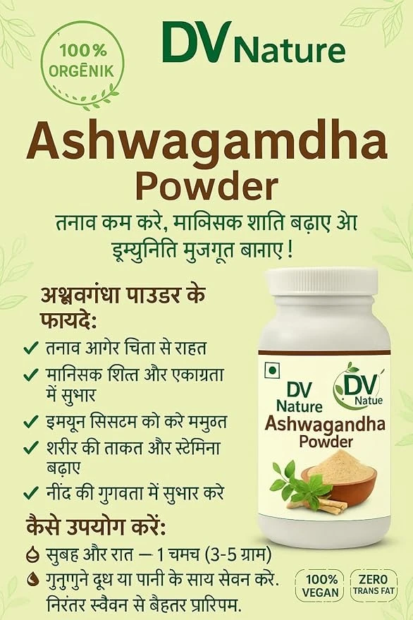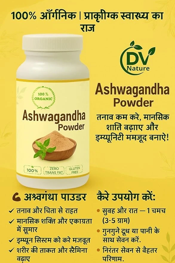 A premium quality herbal supplement that offers a multitude of benefits to enhance your overall well-being. · Sourced from the finest organic farms and meticulously processed, this product is Jaivik Bharat approved, ensuring the purest form of Ashwagandha. · Used for centuries as a general body tonic in India. It may help to help in tension. Also known as Indian Ginseng. Increases energy, stamina and endurance. · These statements have not been evaluated by the Food and Drug administration. This product is not intended to diagnose, treat, cure or prevent any health problems.