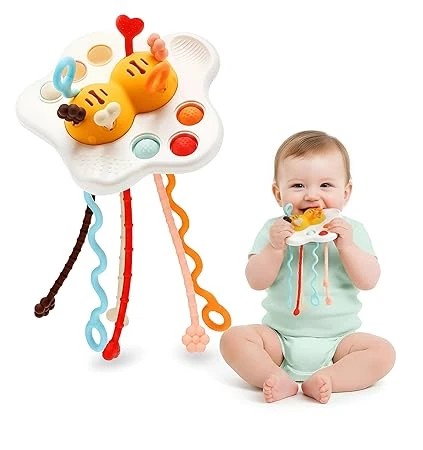 Designed with soft press buttons, a sliding button, and 3 holes, this pull string toy stimulates curiosity, encourages exploration, and develops finger flexibility. Perfect for babies 6+ months and toddlers 1 2 3 years old.