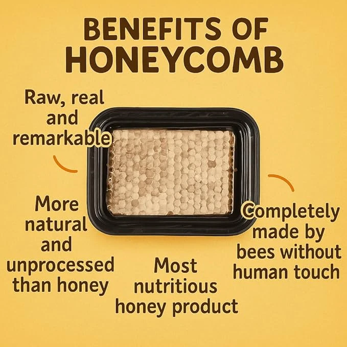 BOOSTS IMMUNE SYSTEM & ENERGY- Honeycomb has been shown to enhance the immune system due to its antibacterial and antioxidant properties. The natural sugars in honeycomb (glucose and fructose) provide a quick energy boost, which makes it a good option for athletes or anyone needing a quick pick-me-up. It can help in fighting off pathogens and strengthening your body’s defenses.