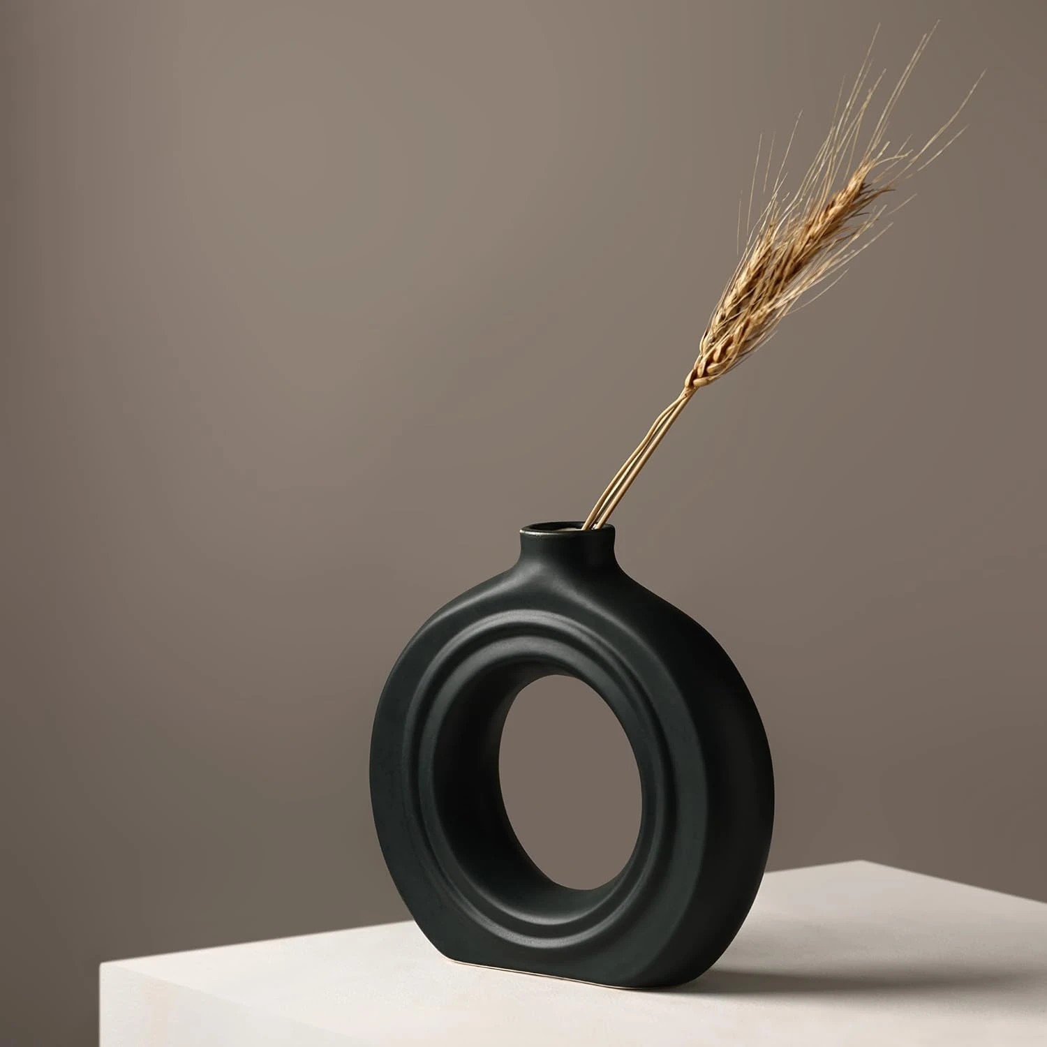 Black Ceramic Donut Vase (5 Inch) | Modern Home Decor Flower Vase for Dried Flowers & Pampas Grass | Elegant vase for Home, Living Room & Office Centerpiece Decor