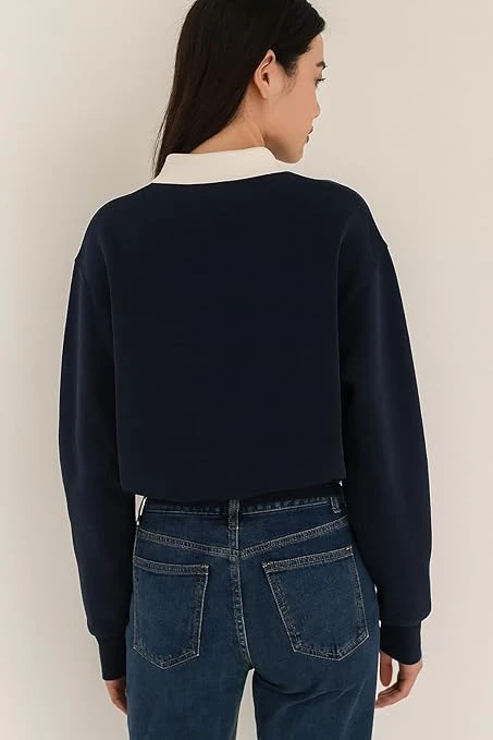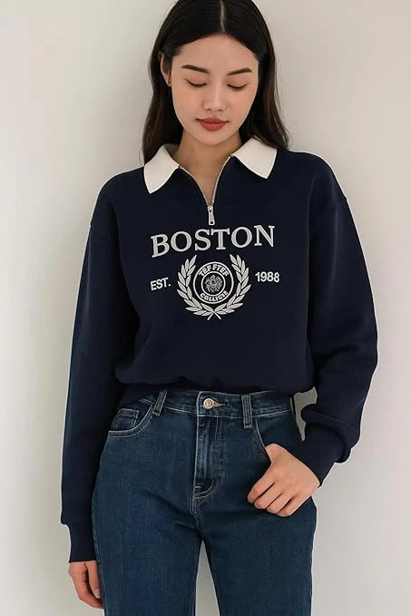 Boston Collegiate Half-Zip Sweatshirt, Cotton Blend Collar, Women's Super Combed Cotton Elastane Stretch Sweatshirt with Round Neck Color Black