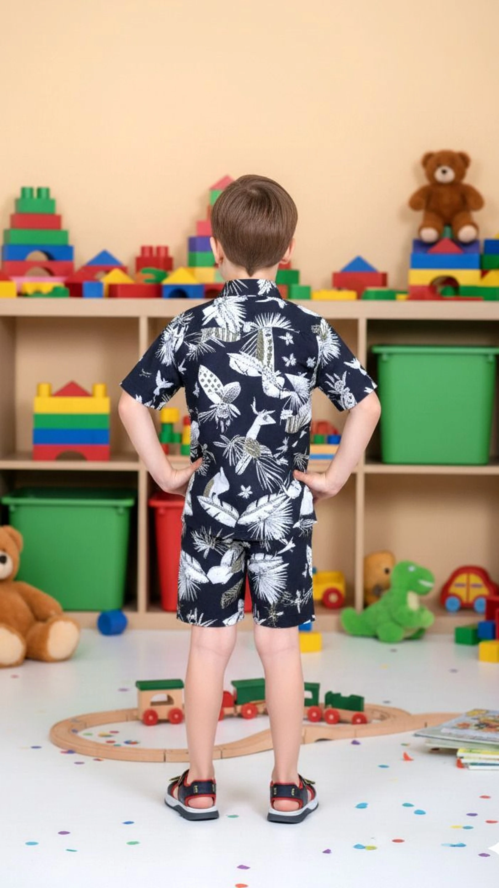 The Shirt: A classic short-sleeve button-down with a crisp pointed collar and a seamless chest pocket. The tailored yet relaxed fit ensures a clean silhouette. The Shorts: Matching mid-length shorts designed for easy movement, perfect for beachside strolls or summer celebrations. The Print: A striking geometric Ikat pattern featuring hot pink rosettes, lime green accents, and earthy olive-gold flourishes set against a bright white background.
