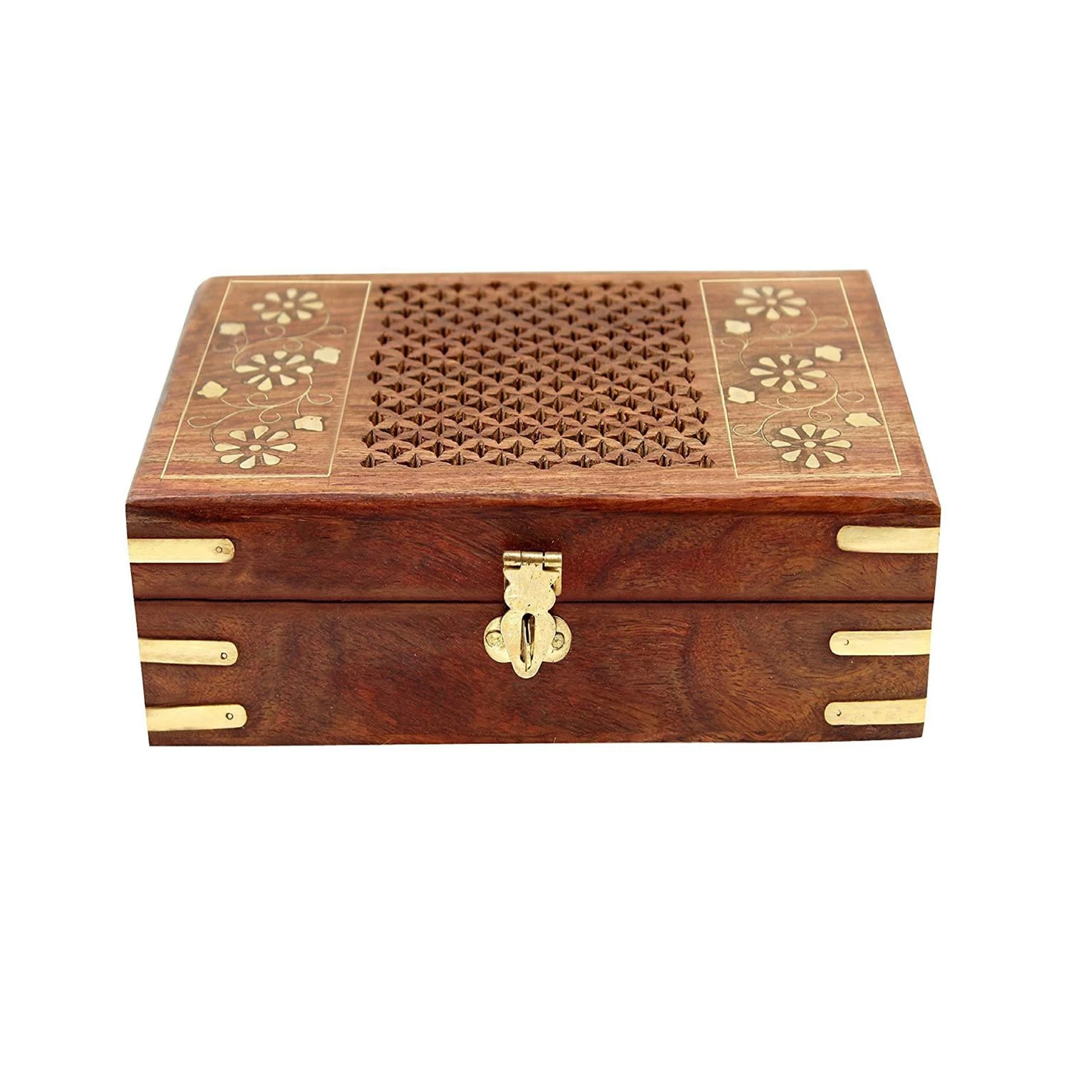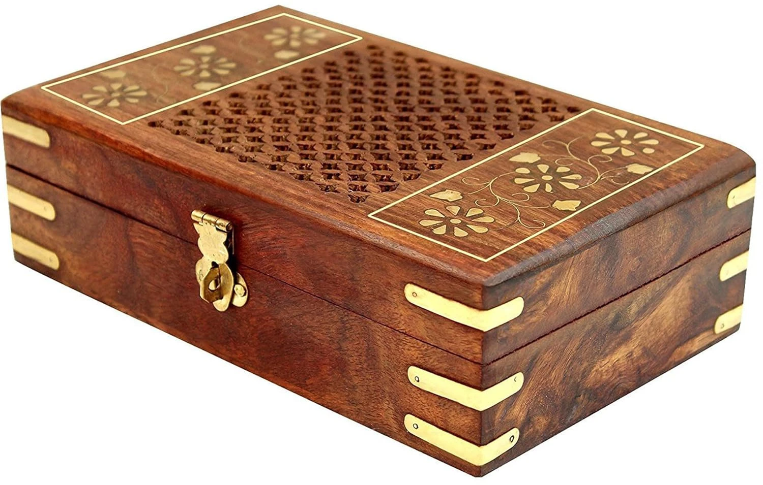 This stunning wooden jewellery box for women features intricate Jali brass work, perfect for storing your treasures.