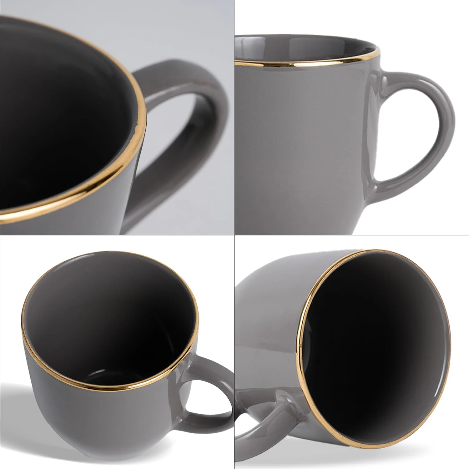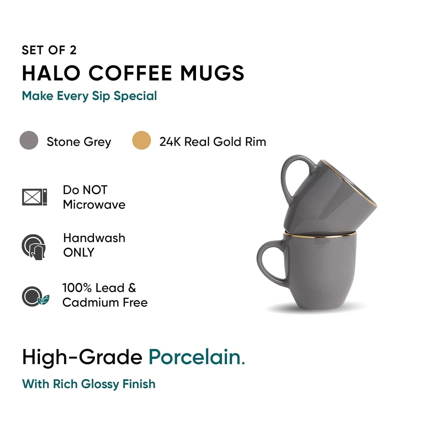 1. Included components: Set of 2 Coffee Mugs, 300ml each. Grey with Real Gold Rim | Finish - Glossy | Elegant, Unique Modern Design