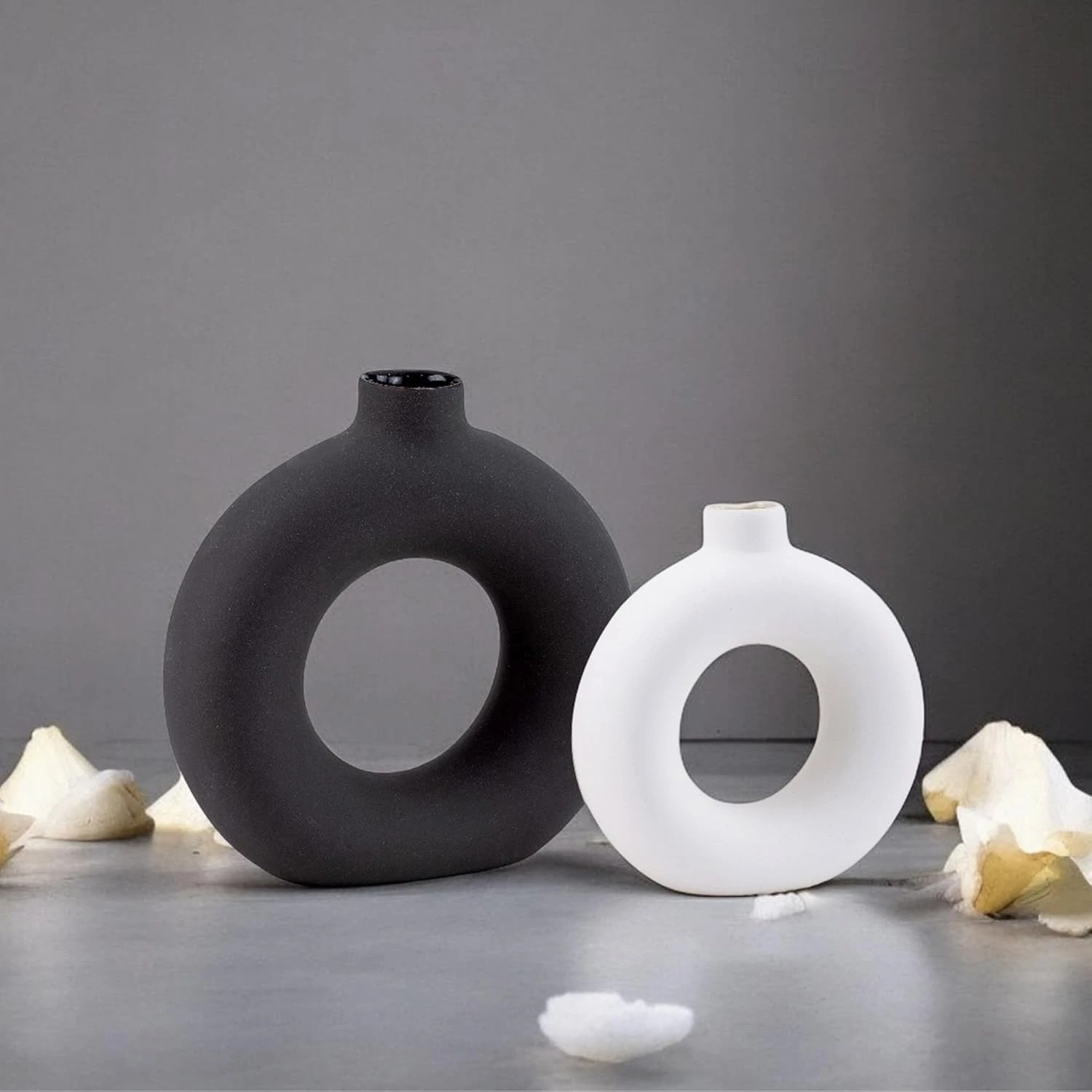 Ceramic Donut Vase | Round Hollow Centerpiece | Minimalist Flower Vase for Pampas Grass & Table Showpiece | Ideal for Living Room, Home, Shelf & Office Decor (White & Black, 7 & 9 inch) Pack of 2
