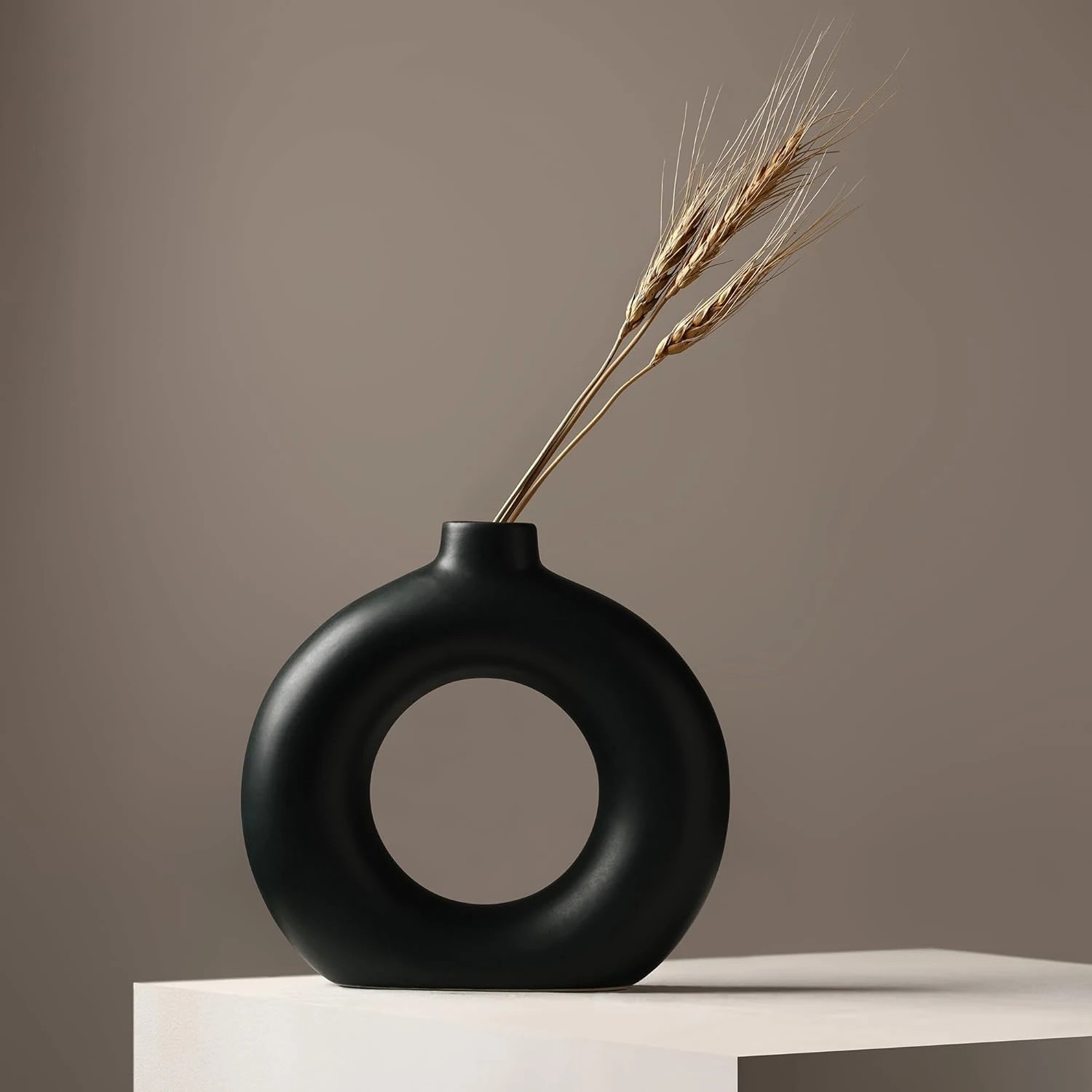 Ceramic Donut Vase | Round Hollow Centerpiece | Minimalist Flower Vase for Pampas Grass & Table Showpiece | Ideal for Living Room, Shelf & Office Decor (Black, 5 inch)
