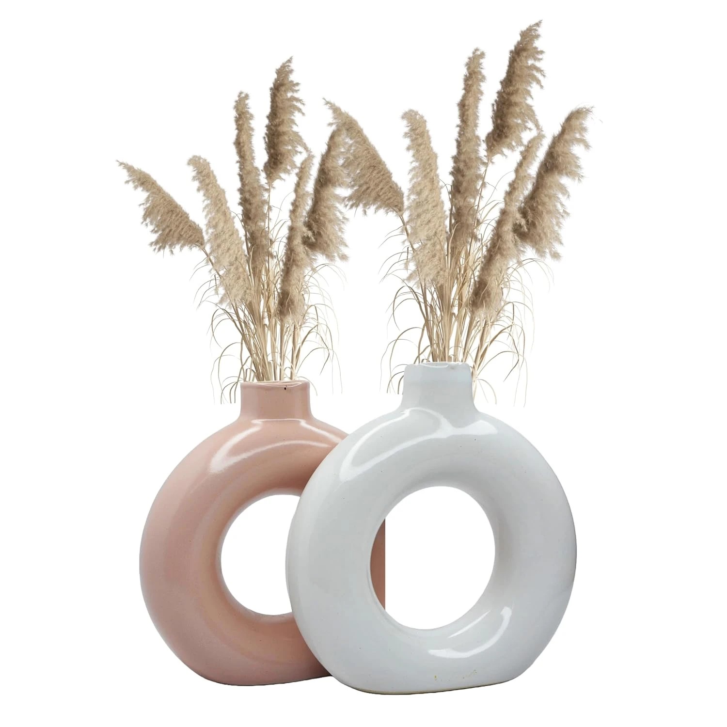 Ceramic Donut Vase Set of 2, Modern Minimalist Design, 6 x 6 inch, Pink and White