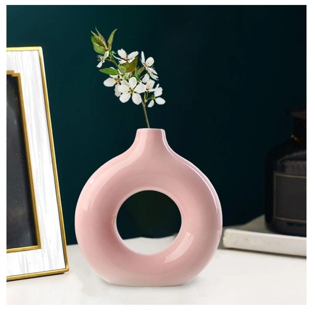 Ceramic Donut Vase, White Flower Vase for Pampas Grass & Dried Flowers, Modern Home & Office Centerpiece, Elegant Gift Vase Only- (Glossy Pink 6 Inches, 1 Piece)