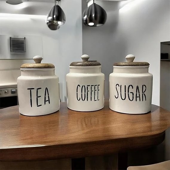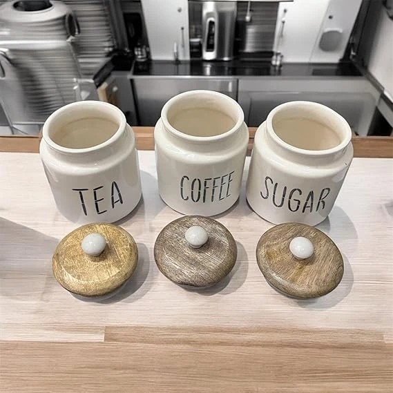 Ceramic Tea Coffee Sugar Containers Set of 3 | Tea Coffee Sugar Canister Jars with Airtight Wooden Lid | Kitchen Storage or tea coffee sugar White Barni