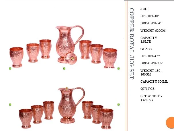 The royal design and polished copper finish give this set a premium and sophisticated look, making it a centerpiece on your dining table. The jug features a sturdy handle and a smooth pouring spout for convenience, while the glasses are designed for a comfortable grip and elegant serving experience.