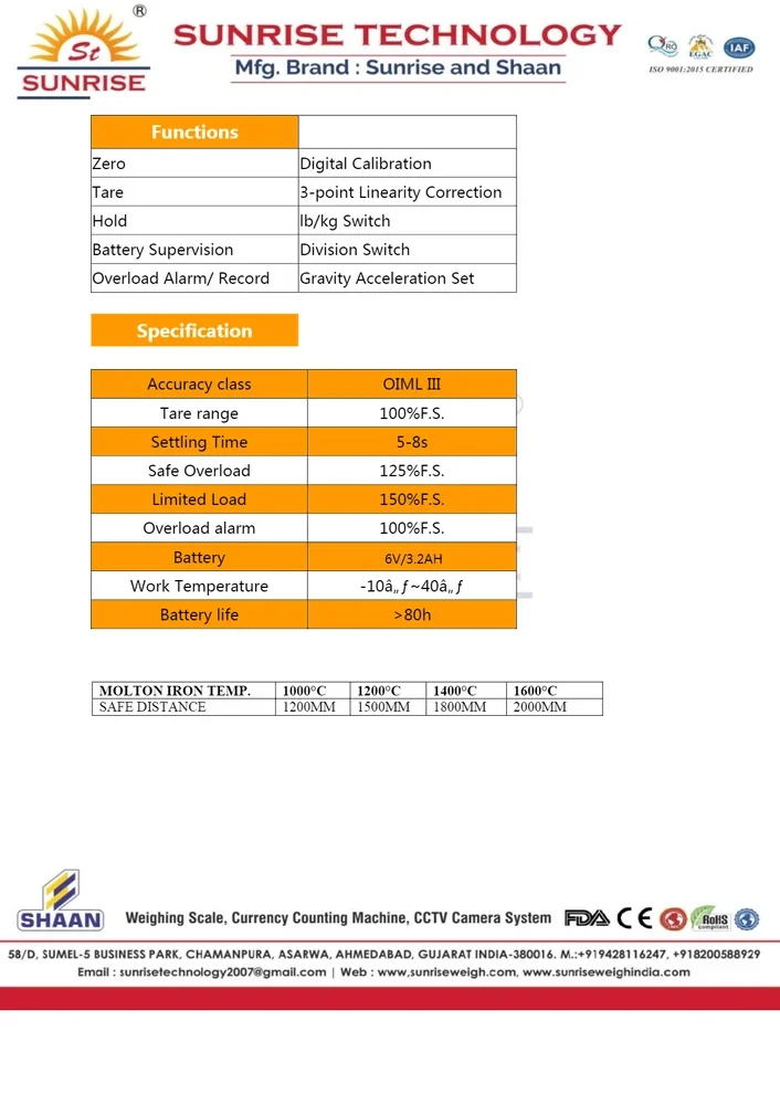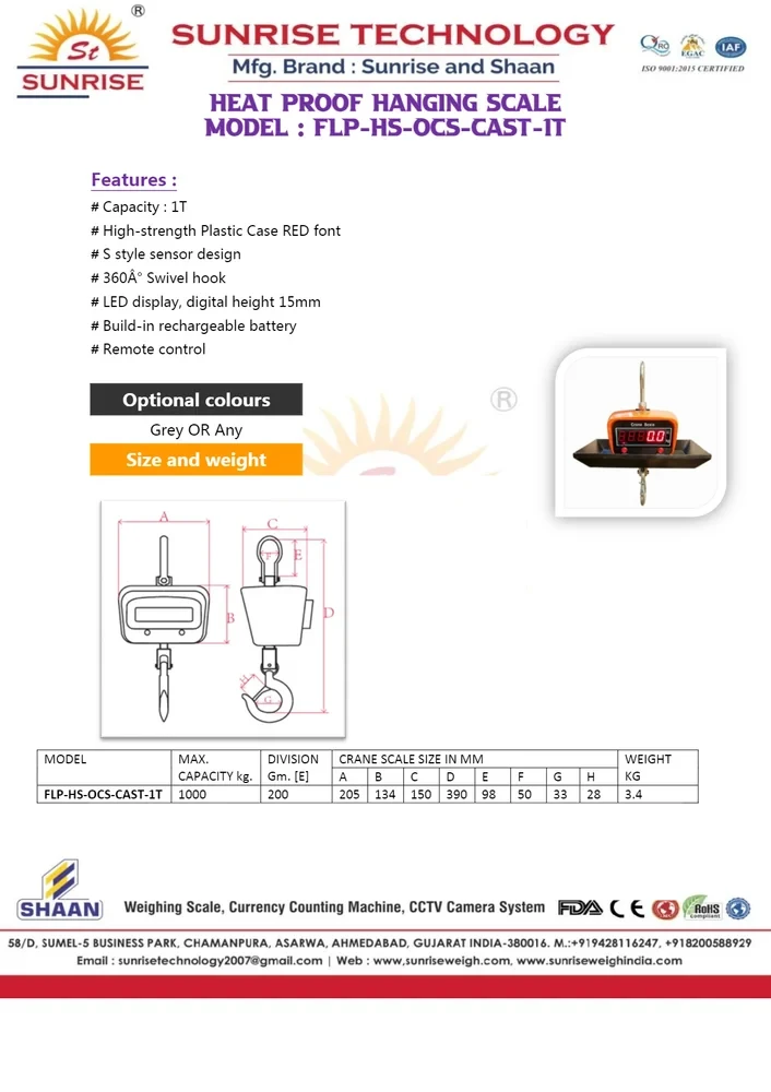OCS 1 Ton x 200 Gm Heatproof Crane Scale Digital Foundry Crane Scale