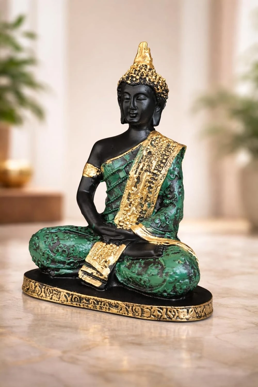 Decorative Buddha Figurine, Black and Gold, Resin, Meditating Pose, Traditional Asian Style, Religious Theme (Green Black)