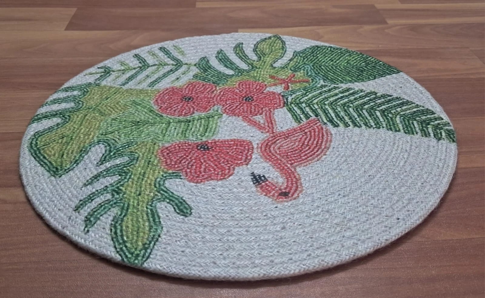 •  Beautiful round cotton placemat featuring whimsical bird and floral pattern in orange, blue, and green colours on a light background