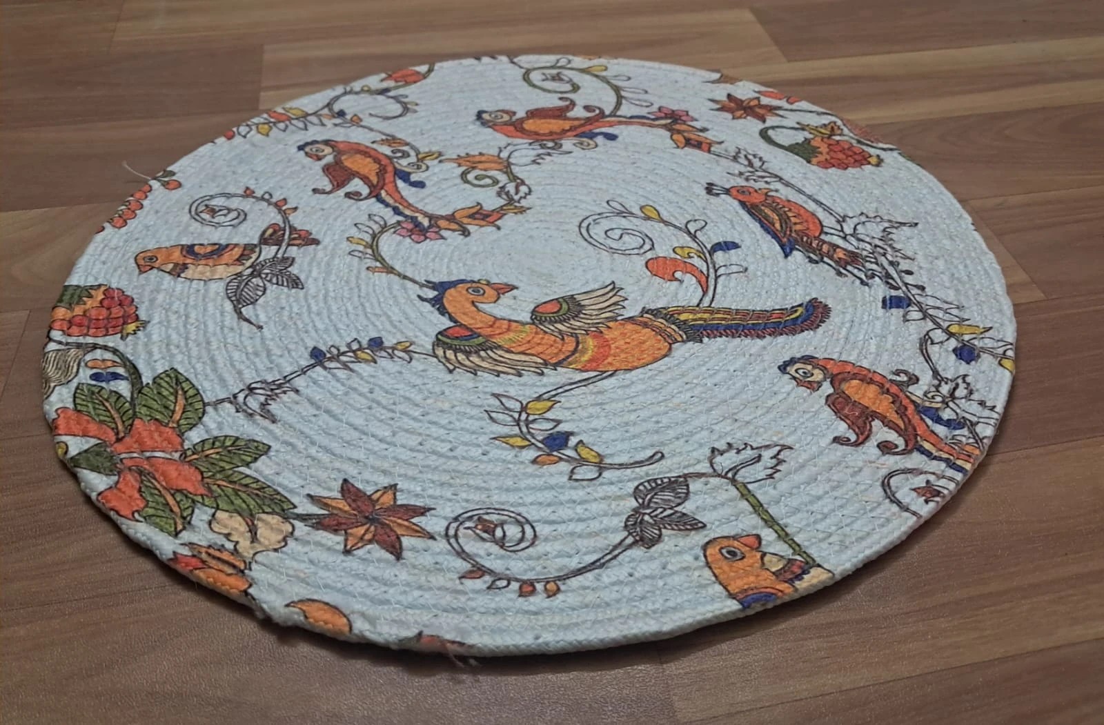 •  Beautiful round cotton placemat featuring whimsical bird and floral pattern in orange, blue, and green colours on a light background
