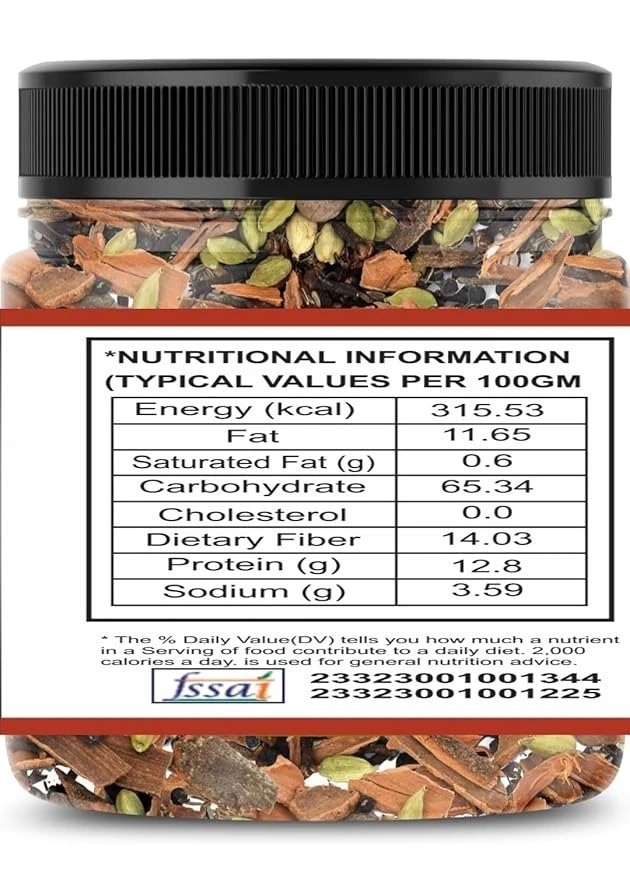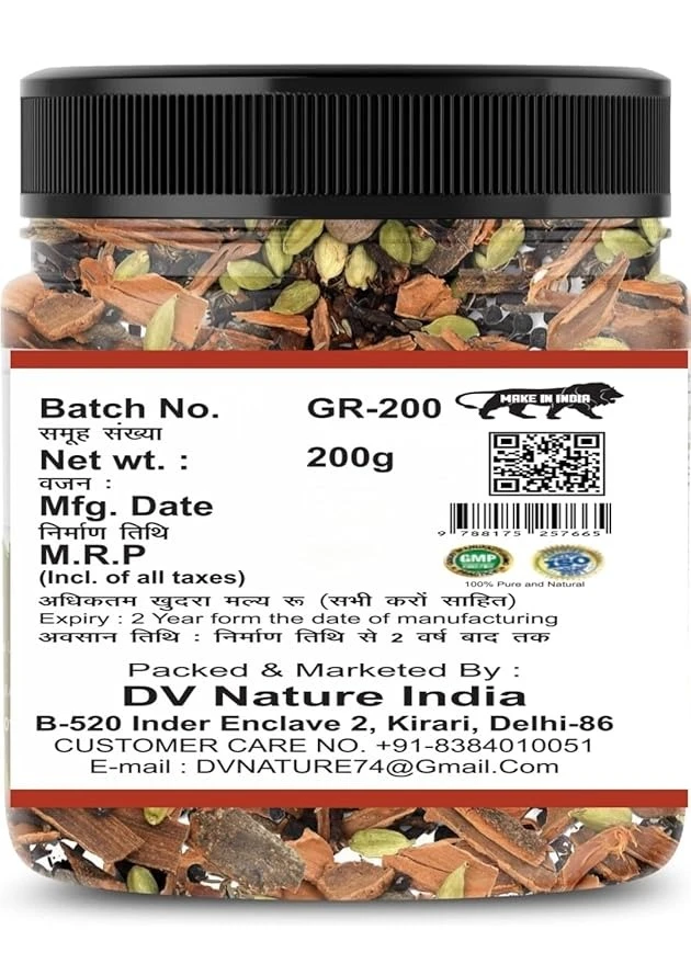 Total Quantity 200 Grams Jeera-100 Grams Kali Mirch sabut-30 Grams Badi Elaichi- 10 Grams Choti Elaichi- 8 Grams Dal Chini10 Grams Peepli Bai-6 Gram Chakriphool--6 Gram 8.Laung-10 Gram Tej Patta-5 Gram Saunth sabut-10 Gram Jayitri-5 Gram Total-200 Gram