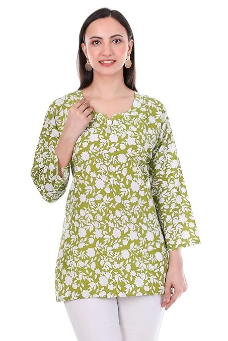 Erosion Fashion Women's Cotton Floral Print Short Kurti, Round & V-Neck, 3/4 Sleeve, Straight Short Kurta| A line Topper Color Maroon Size Small