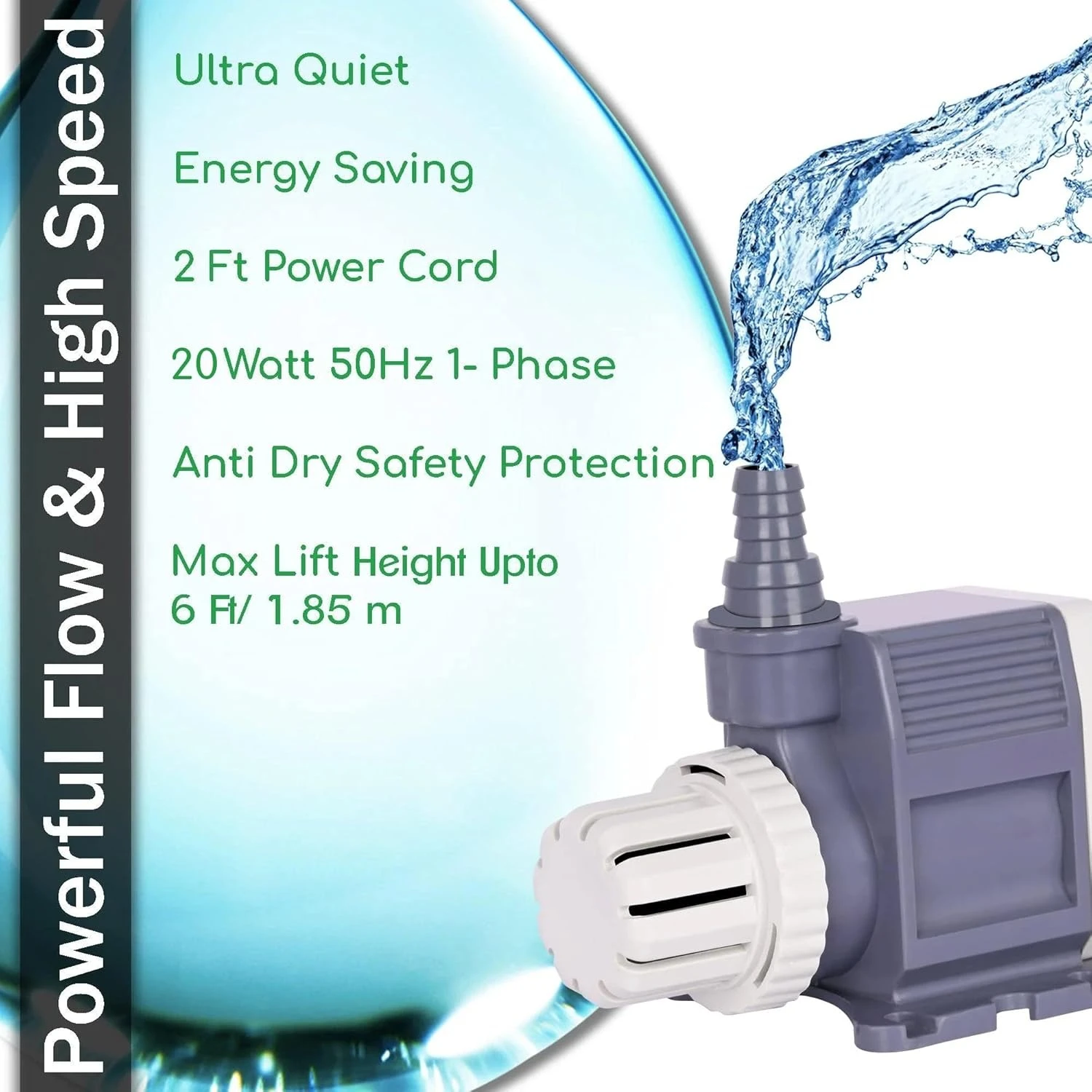 ▶STRONG POWER AND HIGH LIFT - Gives you a true flow rate of 1250 LPH ( at zero height ) and a water lift of 1.98m/6.5 Feet, 20W High-Quality Motor for energy saving. Lift height is the max height the water goes up, after connecting the water pipe to the nozzle (Make sure the joint is sealed securely and tightly), NOTE - Please check the water lifting height before making a purchase.