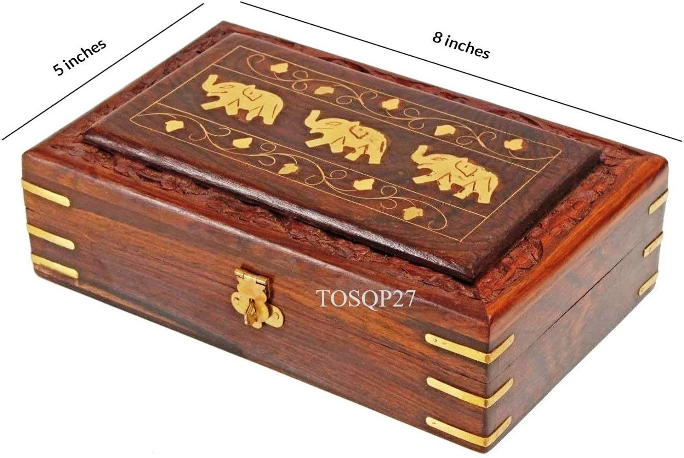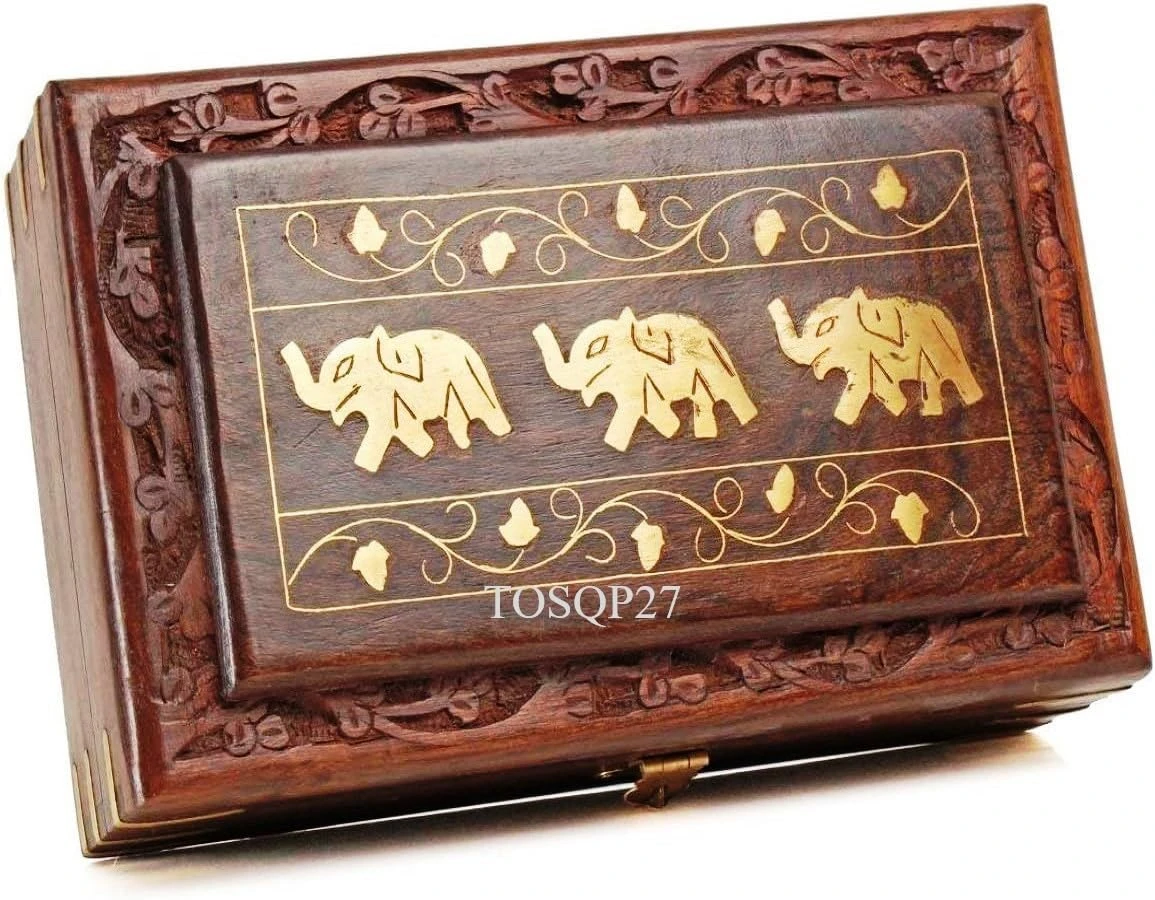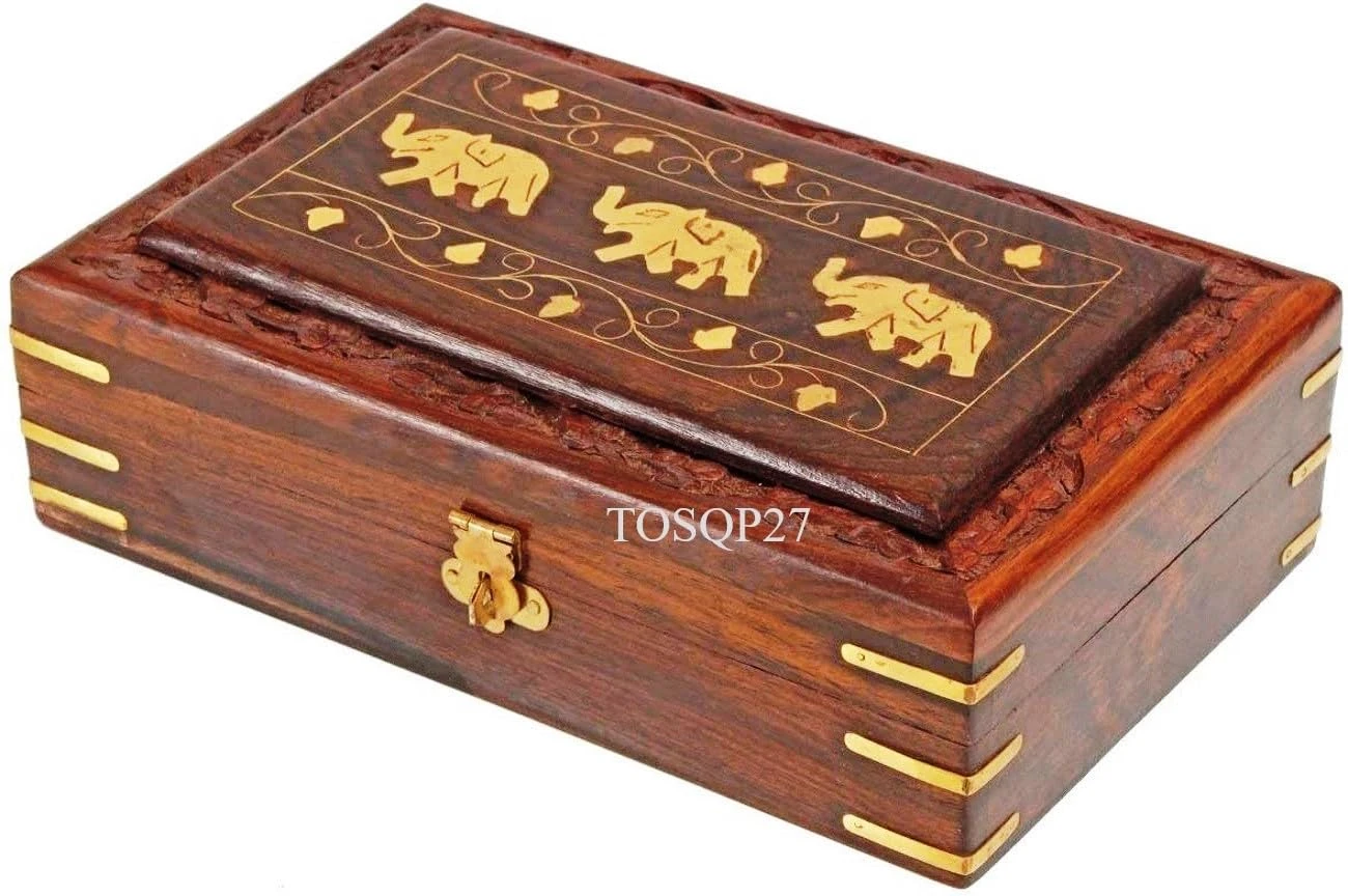 Gift Jewelry Box Brass Elephant Inlay Hand-Carved Rosewood 8-Inch – Wooden Keepsake Storage Box – Velvet Lined – Christmas Gift for Women, Girls, Mom – Artisan Made Organizer