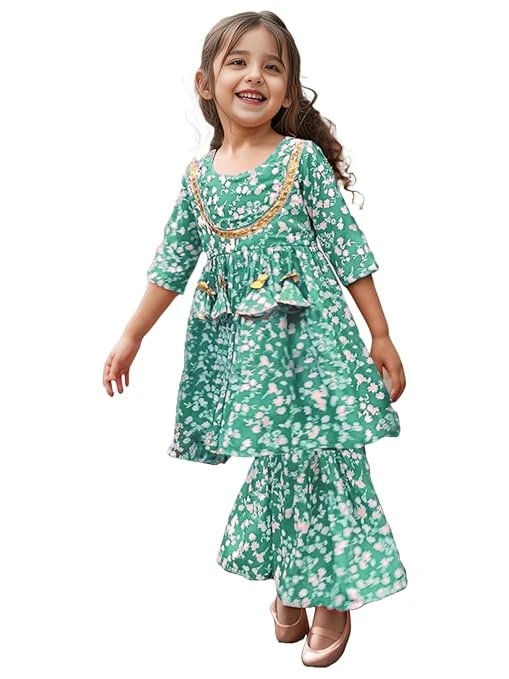 Girls Poly Silk Floral Printed 3/4 Sleeve Sharara Set | Traditional Ethnic Wear Clothing Set for Festival and Special Occasions Size Age 11-12 Year Color Light Green