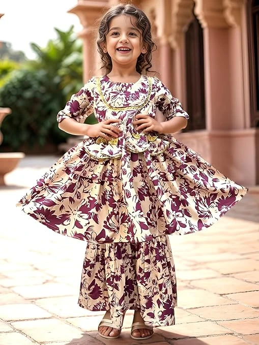 Girls Poly Silk Floral Printed 3/4 Sleeve Sharara Set | Traditional Ethnic Wear Clothing Set for Festival and Special Occasions Size Age 11-12 Year Cream