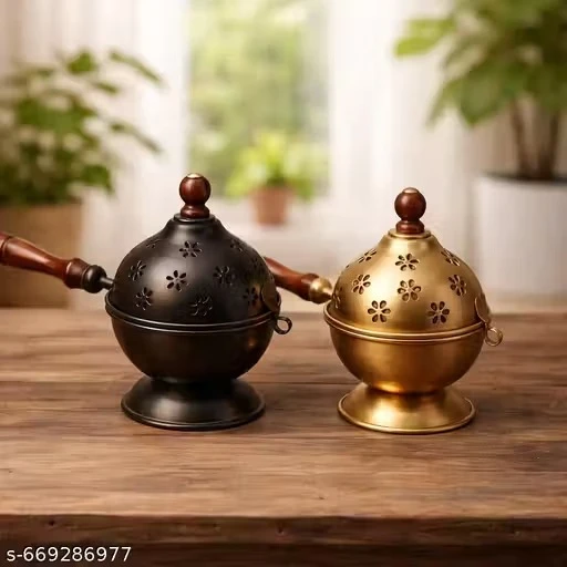 Set of 2 Gold/Black Incense Burner, Loban Burner with Handle, Dhoop Dhuni Burner Sambrani Dhoop Burner for Home Office Temple Prayer Butler