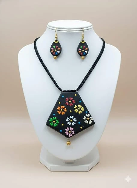1. Handcrafted Terracotta Jewelry Beautifully handcrafted terracotta necklace set featuring a detailed floral pendant. Designed to reflect traditional Indian artistry while adding an elegant ethnic touch to modern outfits.