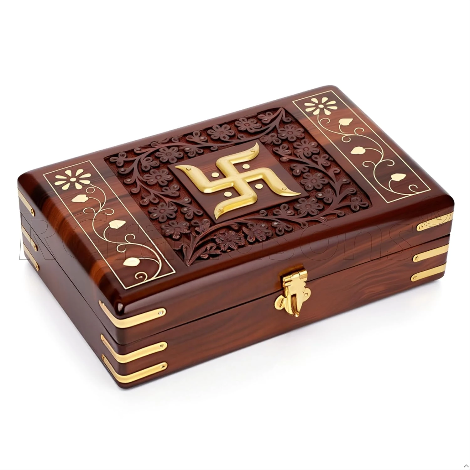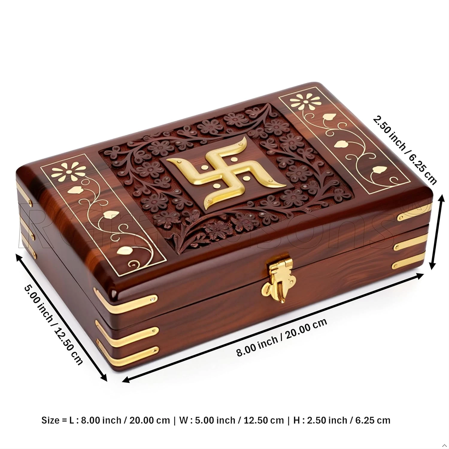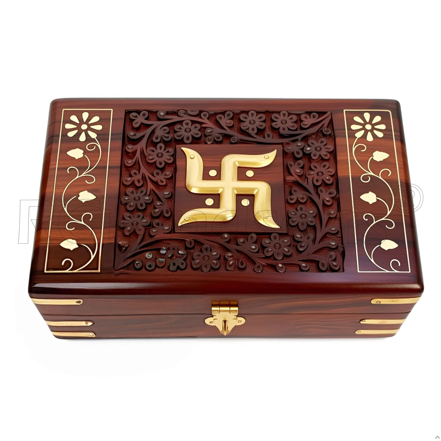 Handmade Wooden Keepsake Storage Box Jewelry Trinket Holder Organizer Floral Hand Carvings with Brass Inlay 8 inch (8.0x5.0 inch_RG0112)