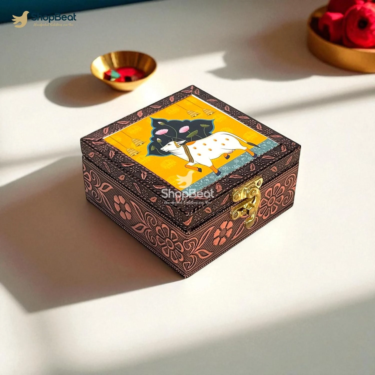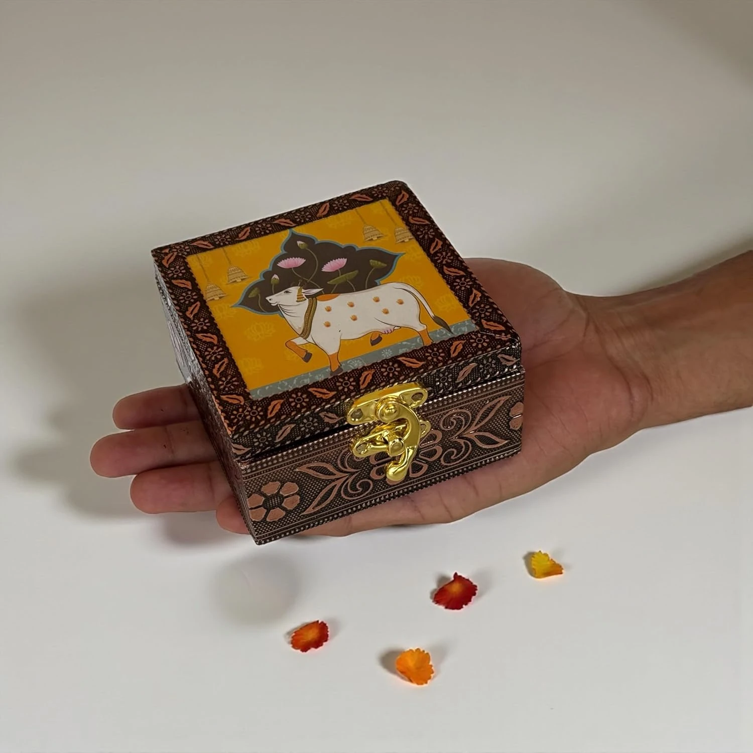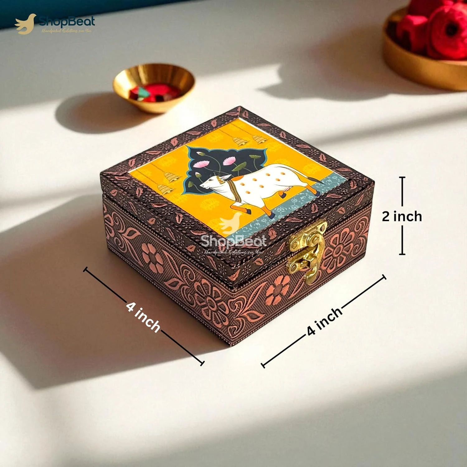Handmade Wooden Pichwai Design Jewellery Box with Lock – Oxidised Finish, 4x4 Inch Organizer for Earrings, Rings, Necklace – Return Gift for Wedding, Pooja, Anniversary
