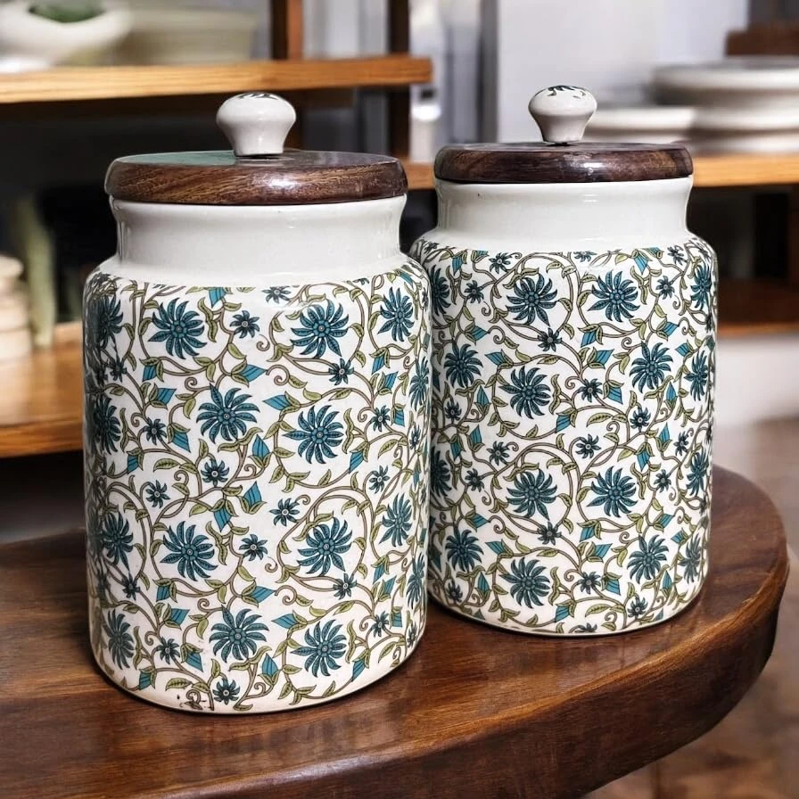 Handpainted Ceramic Jars with Airtight Wooden Lid | Kitchen Storage | Multipurpose Barni | Pickle jar Storage Container 900ML | Matte Finish | Floral Pattern| Set of 2