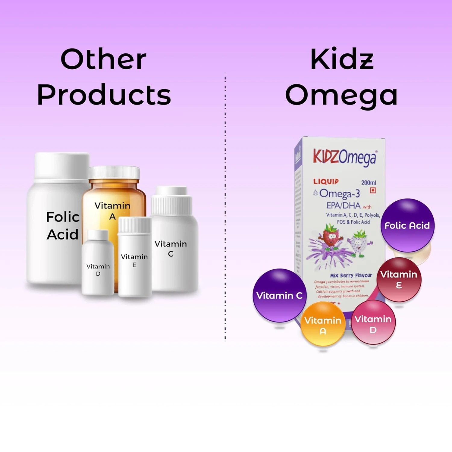 KidzOmega Liquid provides a rich source of omega-3 essential fatty acids EPA and DHA and is enriched with Vitamins A, D, E, C which help to reduce ADHD symptoms and support optimal growth and overall development in your child.