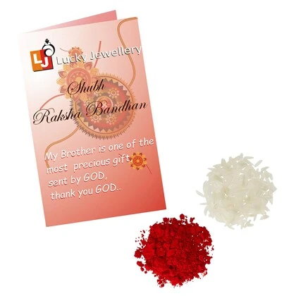 Experience the charm of Raksha Bandhan with our meticulously handcrafted Rakhi, created by the best artisans with love and adorned with exquisite details. Package Contain: Rakhi, Roli, Chawal & Greeting Cards.