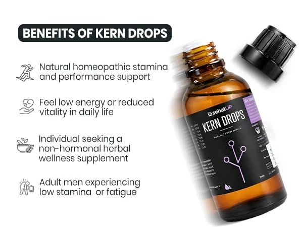 Supports Male Sexual Health & Vitality: Kern Drops are a premium homeopathic blend made to promote male vitality, stamina & overall sexual well-being. They help restore energy levels & enhance performance naturally.