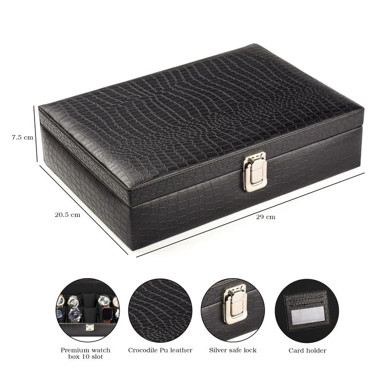 LAAM ALIF 10 Slots Black Unisex Leatherette Watch Box Organiser Watch Box (Black, Holds 10 Watches) (Black::Maroon)