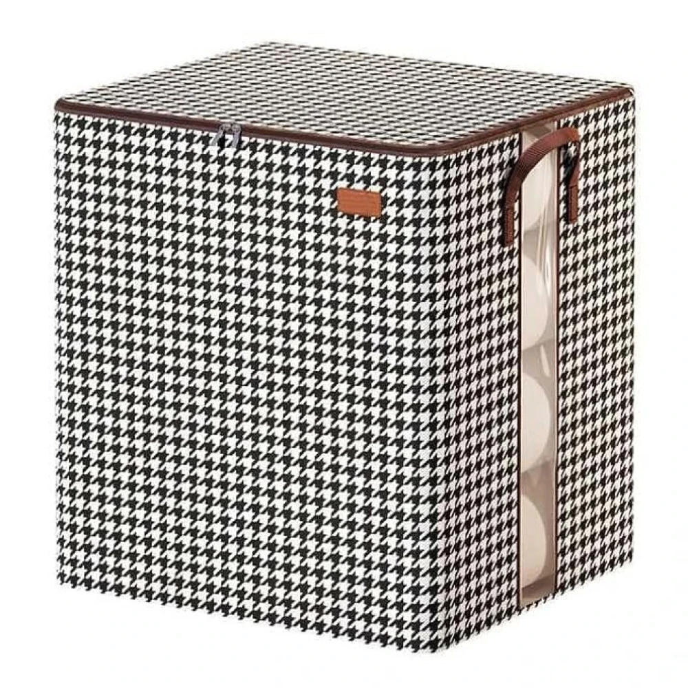 1. STYLISH DESIGN: Classic houndstooth pattern storage box featuring elegant brown trim and leather-look accents for sophisticated home organisation
