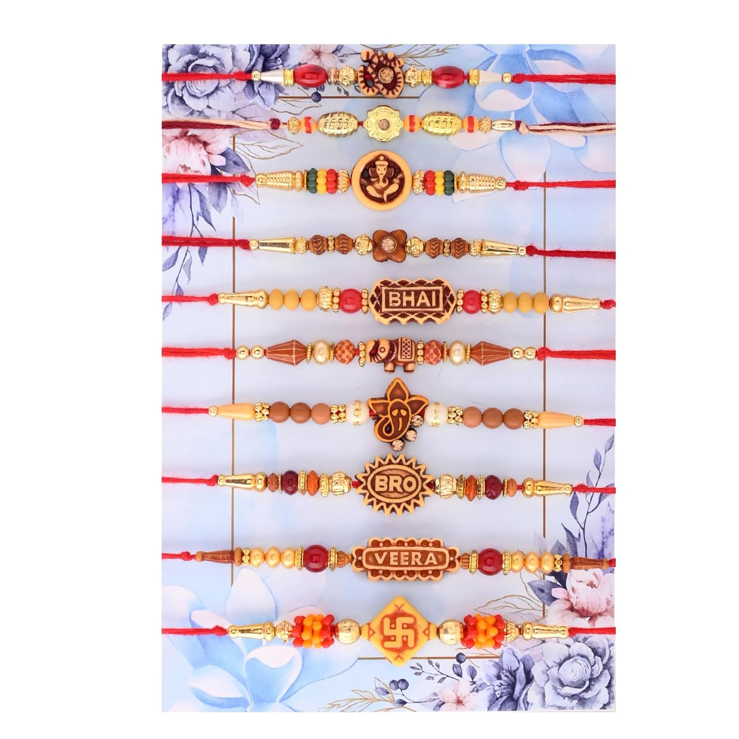 1. Package included: 10 Assorted Designer Rakhi with Tilak pack.