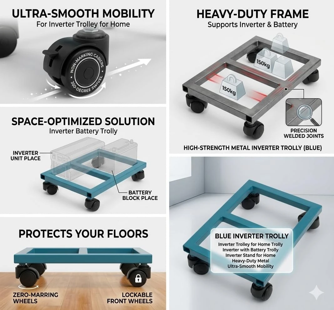 1. LONG-LASTING & RELIABLE UTILITY ACCESSORY With its durable metal construction and smooth wheel mobility, this inverter battery trolley stand is designed for everyday use. It offers a perfect combination of strength, convenience, and multipurpose functionality, making it a valuable addition to any home or workspace.