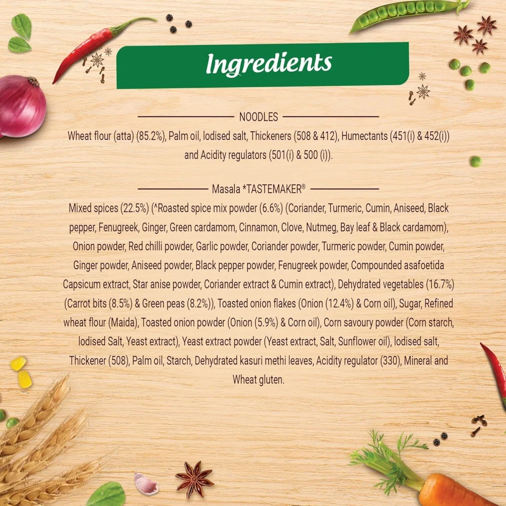 NOODLES Wheat flour (atta) (85.3%), Palm oil, Iodised salt,Thickeners (508, 412), Humectants (451(i), 452(i)) and Acidity regulators (501(i),500 (i)). Masala *TASTEMAKER® Mixed spices (22.5%) [ᶺRoasted spice powder (6.4%) (Coriander (1.9%), Turmeric (1.6%), Cumin, Aniseed, Black pepper (0.4%), Fenugreek, Ginger, Clove (0.1%), Green cardamom, Nutmeg), Dehydrated onion (4.2%), Dried garlic, Red chilli powder (2.5%), Red chilli bits (1.1%), Coriander powder (1%), Turmeric powder (0.8%), Dried ginger powder, Aniseed powder, Black pepper powder (0.5%), Cumin powder, ᶺRoasted cumin(0.4%), Fenugreek powder, ᶺRoasted garam masala powder (0.3%) (Cinnamon, Bay leaf (0.04%), Green cardamom, Large cardamom, Black pepper (0.02%)), Compounded asafoetida (Refined wheat flour (maida), Carrier (414), Asafoetida), Spice extract blend (Capsicum extract, Coriander extract (0.001%),Cumin extract), Star anise powder (0.2%)], Toasted onion flakes (Onion(12.4%), Corn oil), Sugar, Dehydrated carrot (8.5%), Dehydrated green peas (8.2%), Noodle powder [Refined wheat flour (maida), Palm oil, Iodised salt, Gluten, Thickeners (508, 412), Acidity regulators (501(i),500 (i)), Humectant (451(i))], Toasted onion powder (Onion (5.9%), Corn oil), Corn savoury powder (Corn starch, Iodised salt, Yeast extract), Yeast extract powder (Yeast extract, Salt, Sunflower oil), Iodised salt, Thickener (508), Dehydrated Kasuri methi leaves (1.4%), Edible starch, Palm oil, Acidity regulator (330) and Mineral (Ferric pyrophosphate).