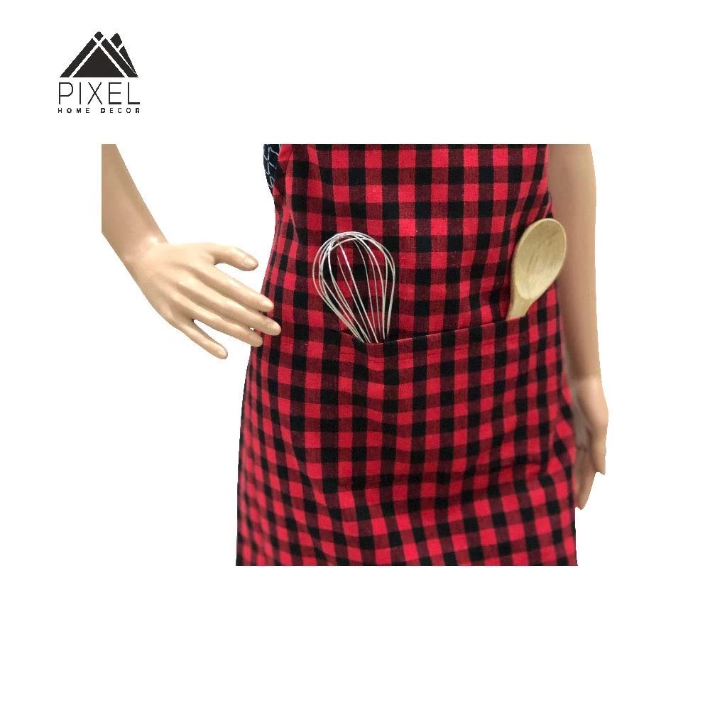 Pixel Home Cotton Checks with Front Center Pocket Design Apron (Red)