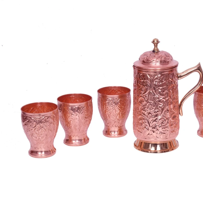 Premium Quality Beautiful and Attractive Polished Copper Nepali Embossed Jug Set for Water Serving & Traditional Use