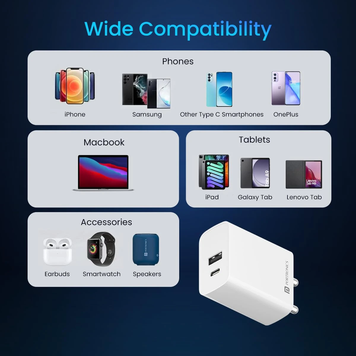 Portronics Adapto 70 33W Fast Charger Adapter with Dual Output (USB + Type C) Supports PPS Charging Via Type C Port, 27W Dash, Warp 27W, Dart, Super Dart 27W(White)