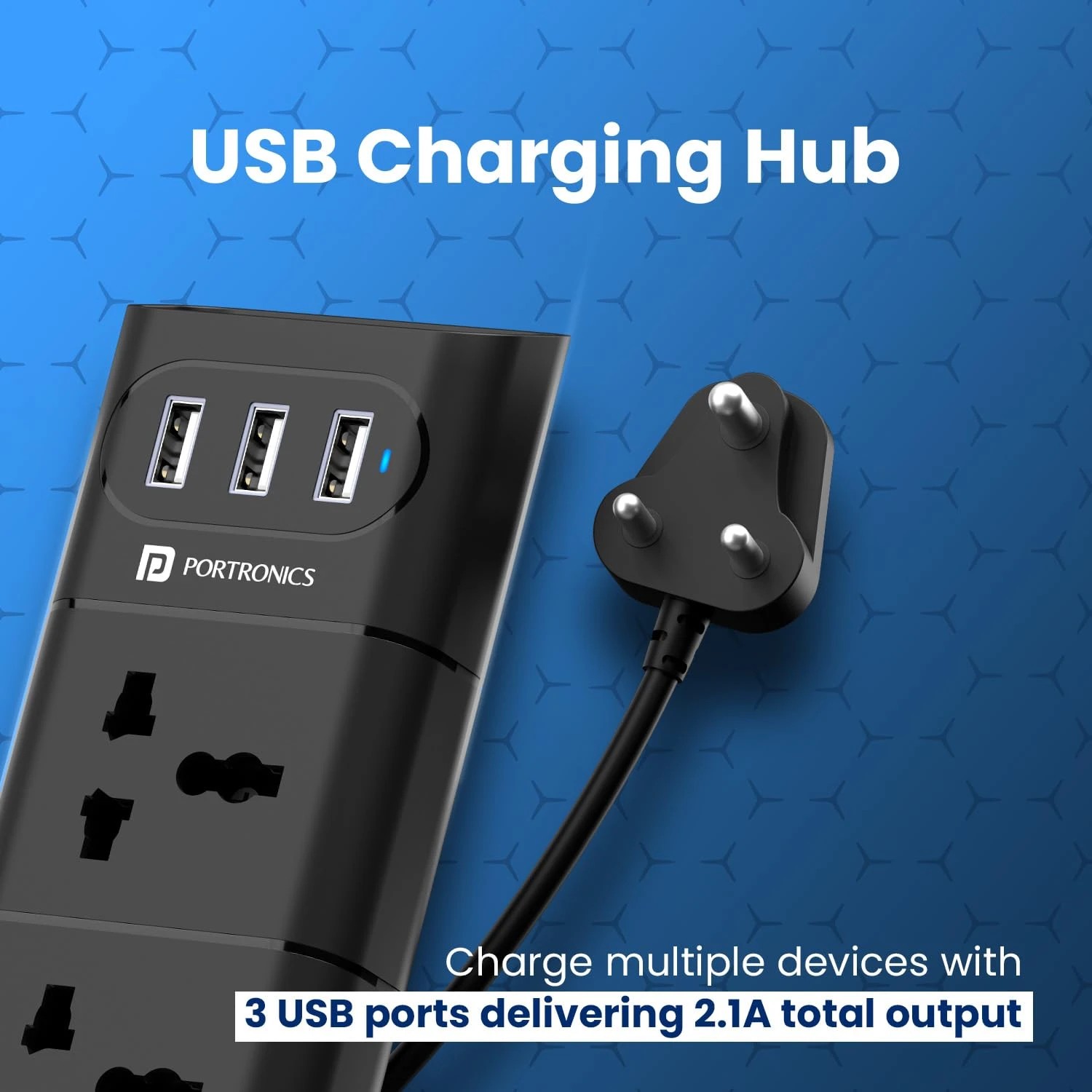 Portronics Power Plate II Extension Board - 1500W - 3 USB Ports, 3 Power Sockets, Overload Protection, Eco-Friendly, 2M Cord Length(Black)