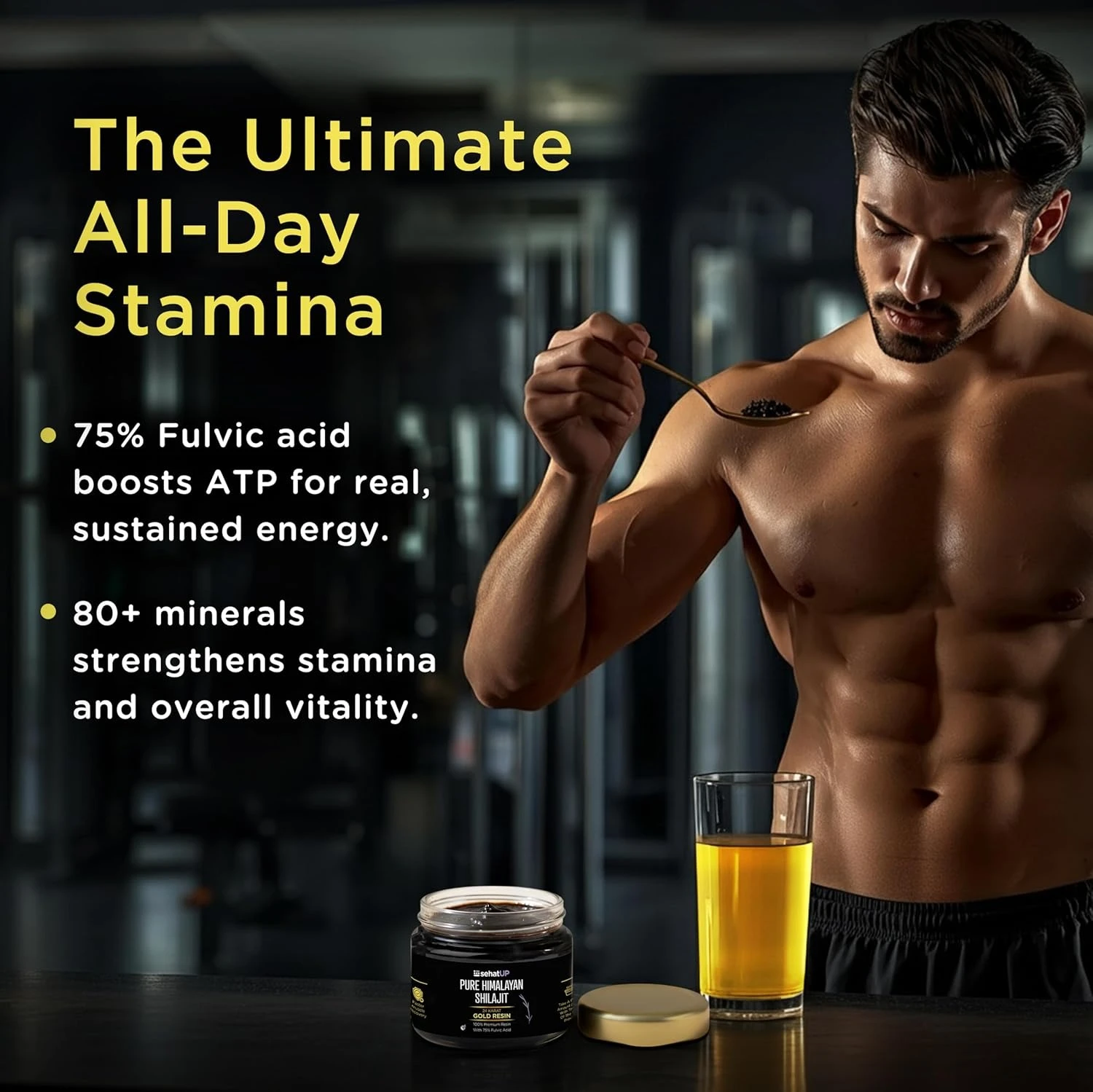 NATURAL ENERGY & STAMINA SUPPORT Power your day with mineral-rich shilajit resin combined with ashwagandha root. Designed to support natural energy levels, endurance, and overall vitality without synthetic stimulants.