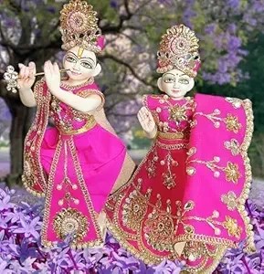Our Radha Krishan Jodi Poshak Silk Shine Dress is a set of six elegantly crafted garments, perfect for celebrating the divine union of Radha and Krishna during Diwali Puja. It includes Patka, Dhoti, and Choli for Krishna, and Lehenga, Chunri, and Choli for Radha, each adorned with intricate designs and silk shine fabric.