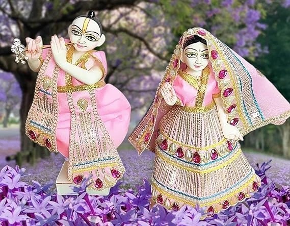 Our Radha Krishan Yugul Jodi Poshak Silk Shine Dress is a set of six elegantly crafted garments, perfect for celebrating the divine union of Radha and Krishna during Diwali Puja. It includes Patka, Dhoti, and Choli for Krishna, and Lehenga, Chunri, and Choli for Radha, each adorned with intricate designs and silk shine fabric.
